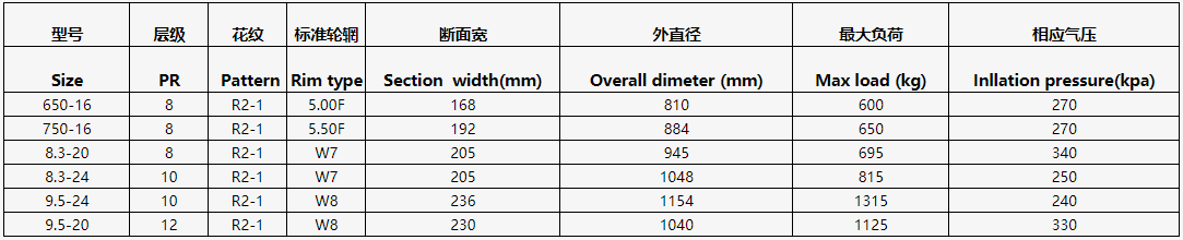 | Size | PR | Pattern | Rim type | Section width(mm) | Overall dimeter (mm) | Max load (kg) | Inllation pressure(kpa) |